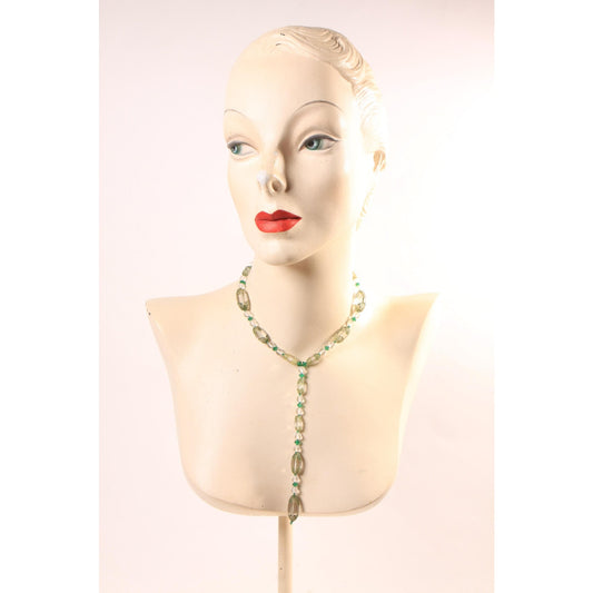 1930s Clear Glass and Green Floral Etched Art Deco Drop Chain Necklace