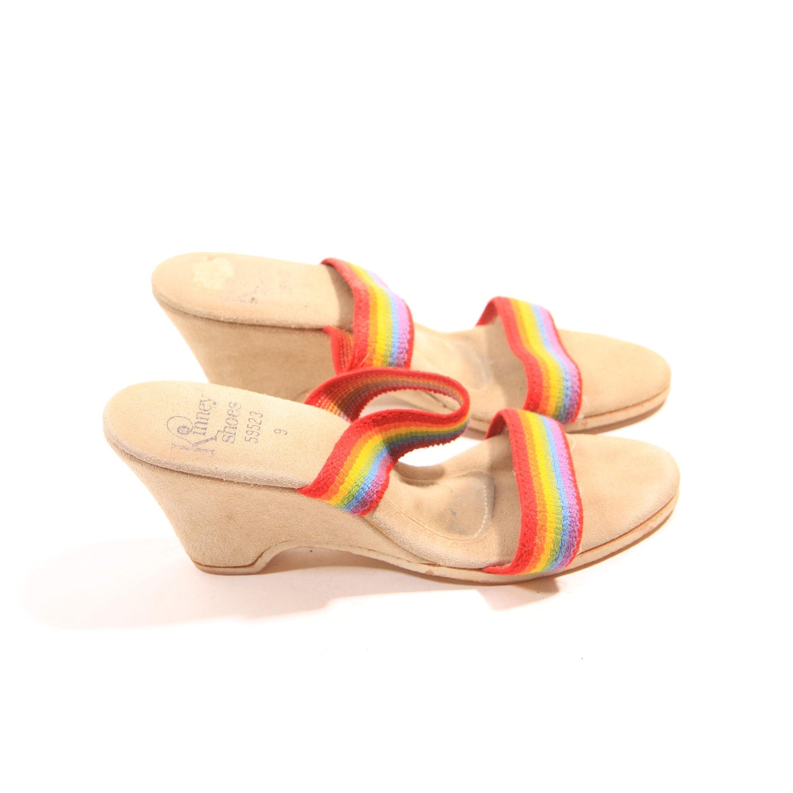 1970s 1980s Rainbow Strap Wedge High Heel Sandals by Kinney Shoes - Size 9