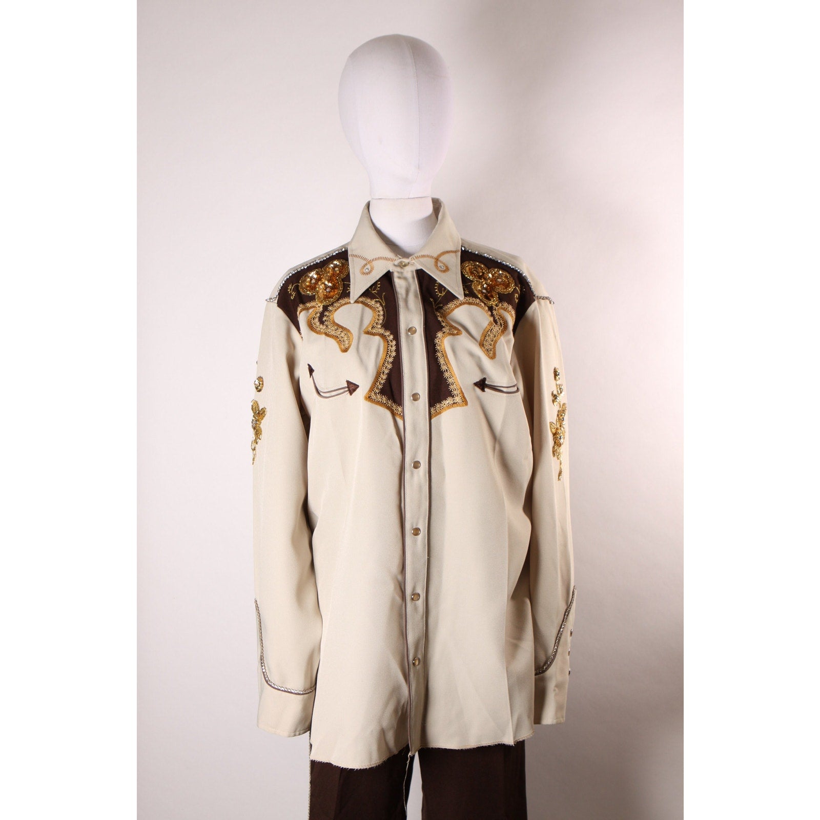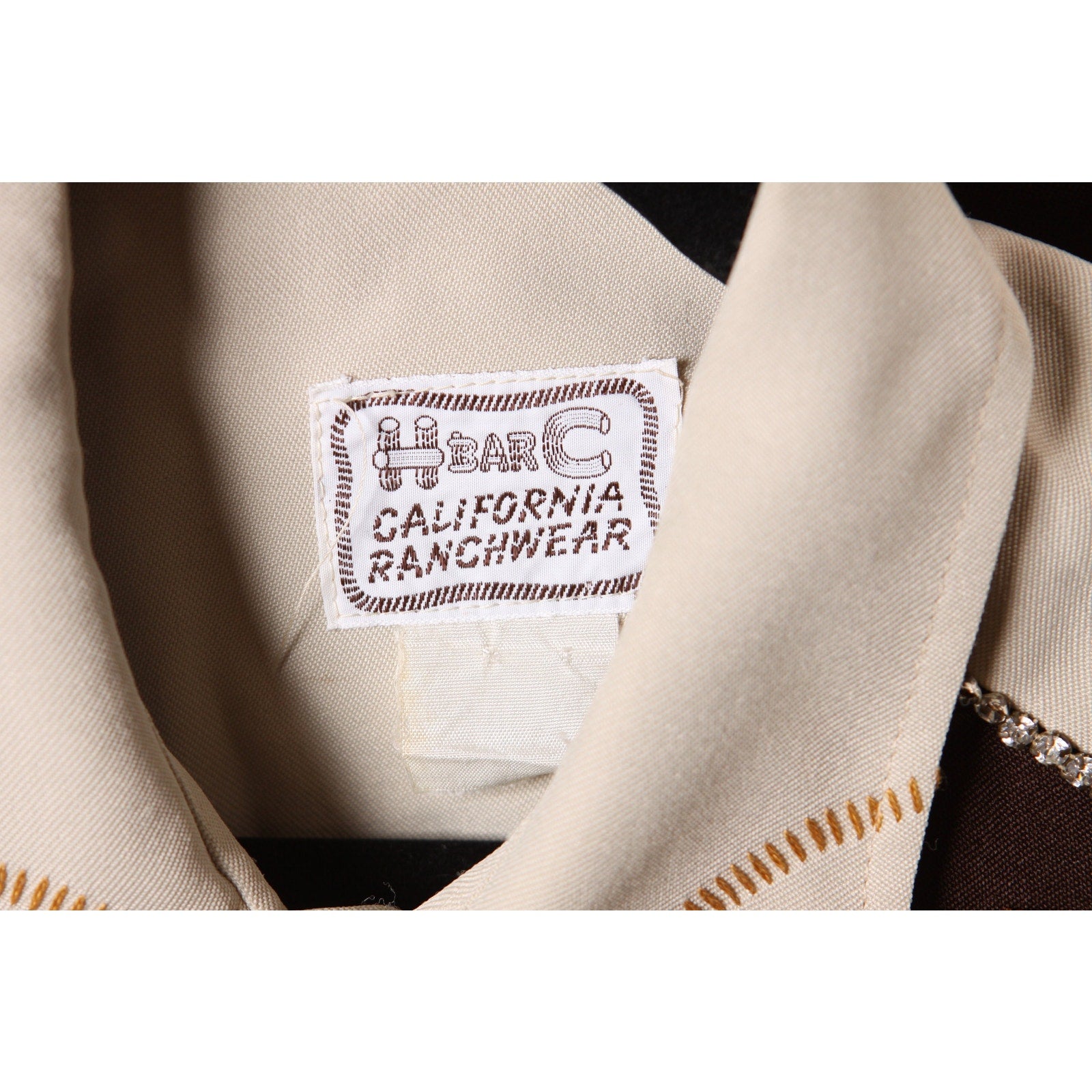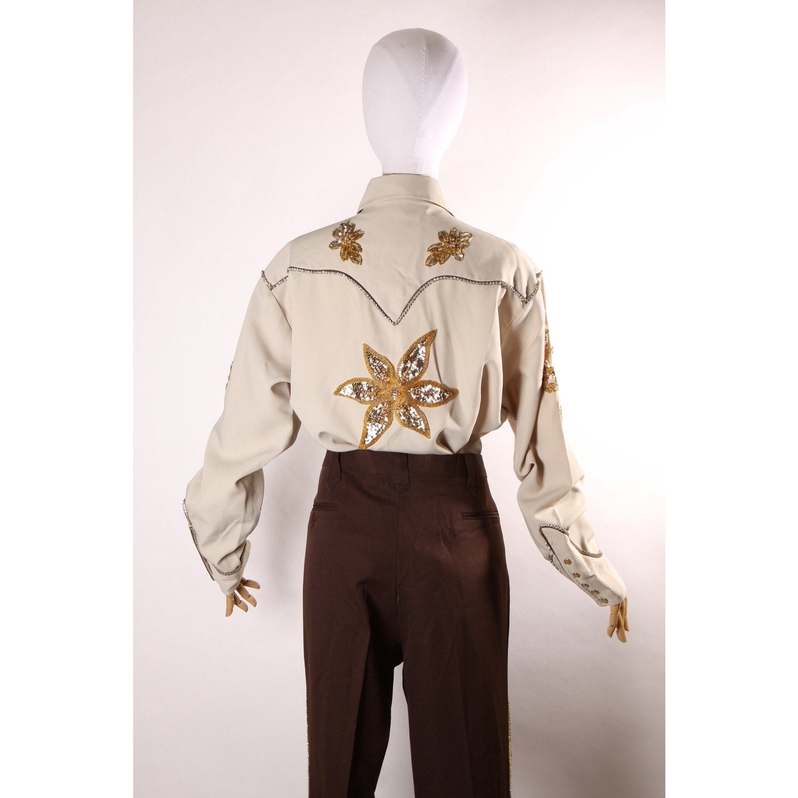 Late 1960s Early 1970s Brown and Tan Gold Metallic Rhinestone and Sequin Roses Western Pearl Snap Top with Matching Pants by H Bar C
